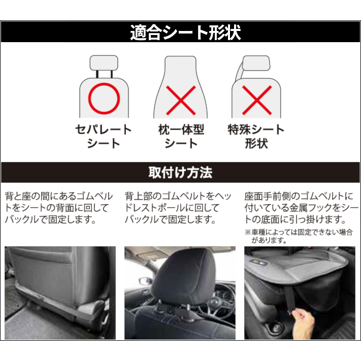 シートへの取付は本体とシート背面をゴムベルトで固定し、ヘッドレストにベルトをかけて長さを調整。前方の金属フック付きベルトをシートの裏側に引っ掛けます。3点で止めるのでズレに強い設計です。