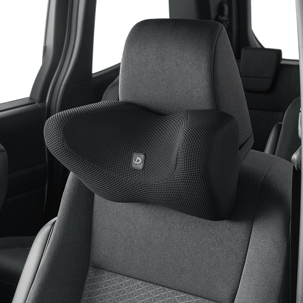 立体形状と中材の高密度低反発ウレタンフォームが体圧をほどよく分散。身体が触れる部分はメッシュ素材でファイテン社の水溶化メタル技術(メタックス)を用いた素材を挟み込みました。ヘッドレストへにはアタッチメント付きのゴムベルトで固定します。