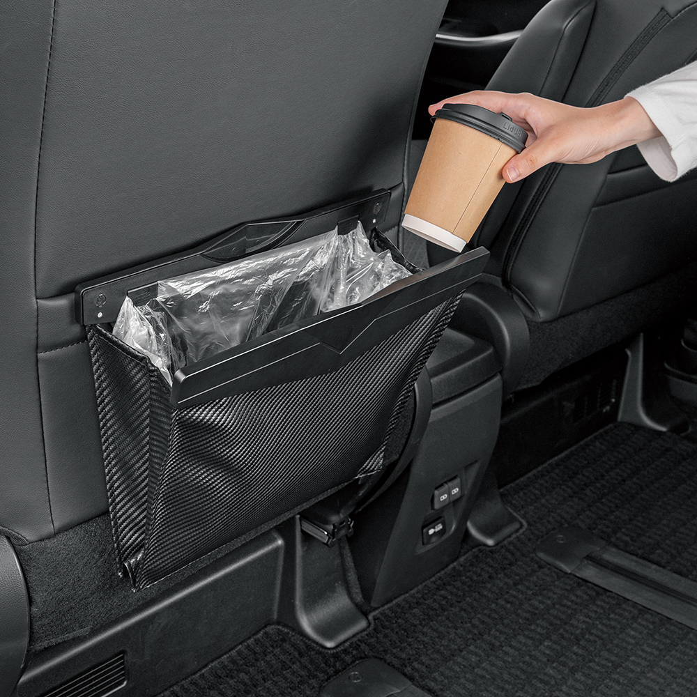 シートバックポケットにフックを掛けるだけで設置可能で、足元のフロアスペースを占有しません。約6cmのマチを設け、約5Lの容量を確保した深底設計により、紙コップ等の厚みがあるゴミを収納した際も確実に口を閉じることができます。