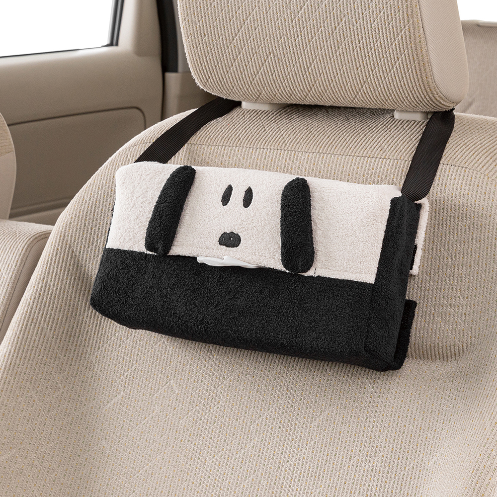 立体的にデザインされた耳のパーツともふっとした肌触りのボア生地がポイント。取り付けの際はカバーの片側に縫い付けられたベルトをヘッドレストステーに通し、反対側の面についた面ファスナーで固定してぶら下げます。外装が6.5cm厚までのボックスティッシュに対応しています。