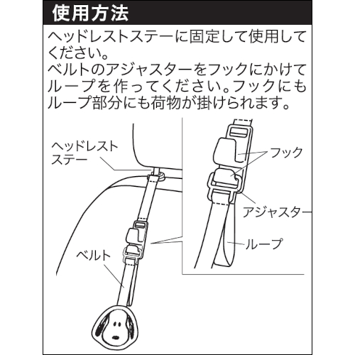 ベルト部分のロゴがアクセント。ヘッドレストステーに引っ掛けて設置し、走行中やブレーキ時、シートに置いたカバンや買い物袋が転倒するのを防止します。耐荷重は約10kg。アジャスター付きのベルト構成で、荷物はフック部分とループ部分の2箇所に掛けることができます。