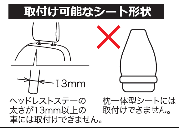 ※ヘッドレストステーが13mm以上のシートやヘッドレスト一体型のシートには取り付けることができません。