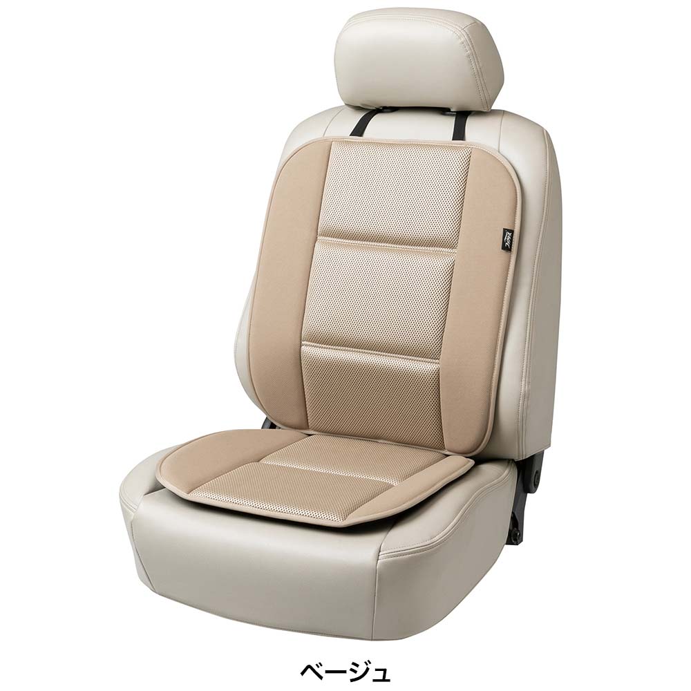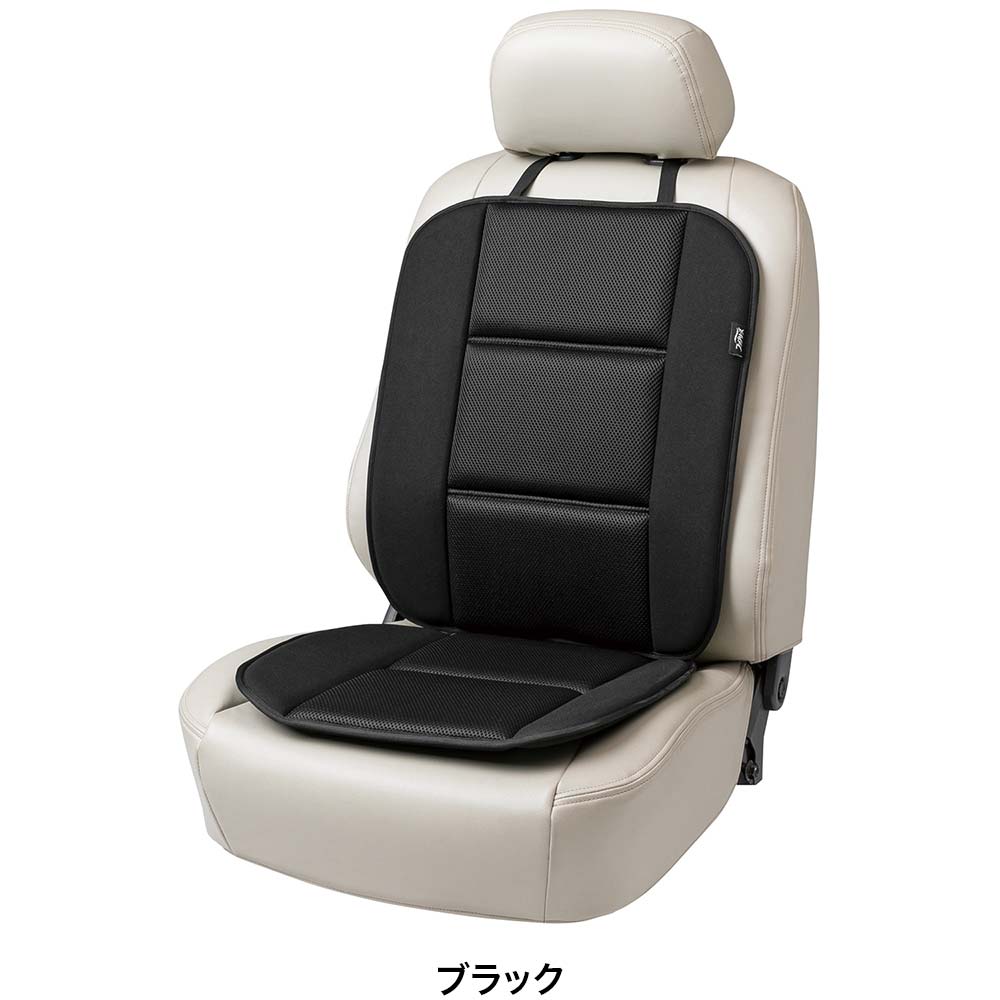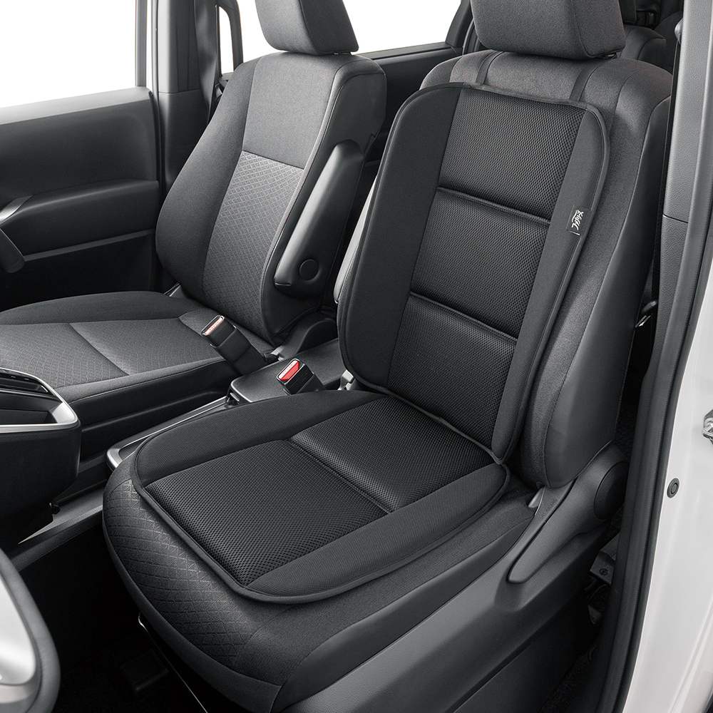 表地は通気性に優れたメッシュ生地と柔らかなニット地を組み合わせ、心地よい肌触りを実現。中材のウレタンフォームが体圧を優しく受け止め、程よい座り心地をサポートします。取り付けの際は、ヘッドレストにベルトをかけてシートの間にストッパーを差し込むだけ。ヘッドレスト部のベルトは長さ調整機能付き。差し込み式のウレタンストッパーが乗り降りの際に感じるズレの不快感を軽減させます。