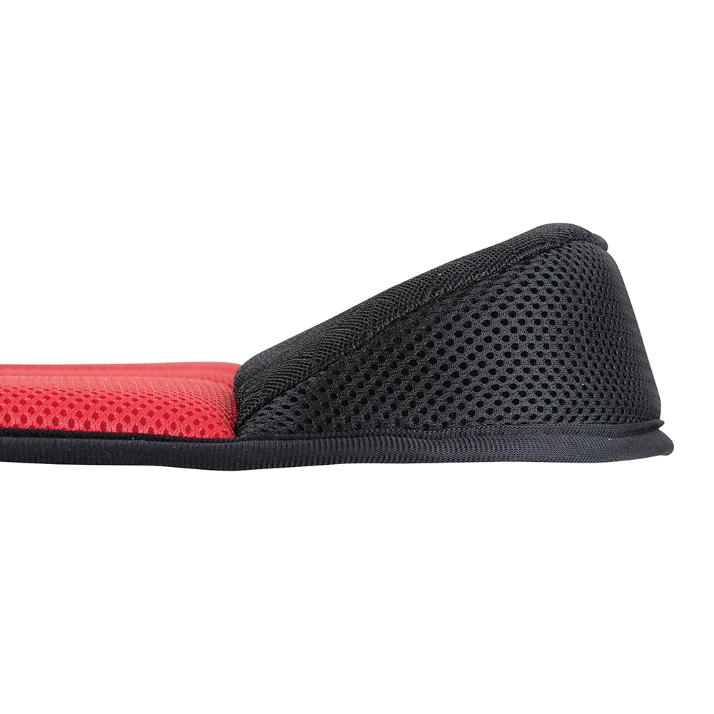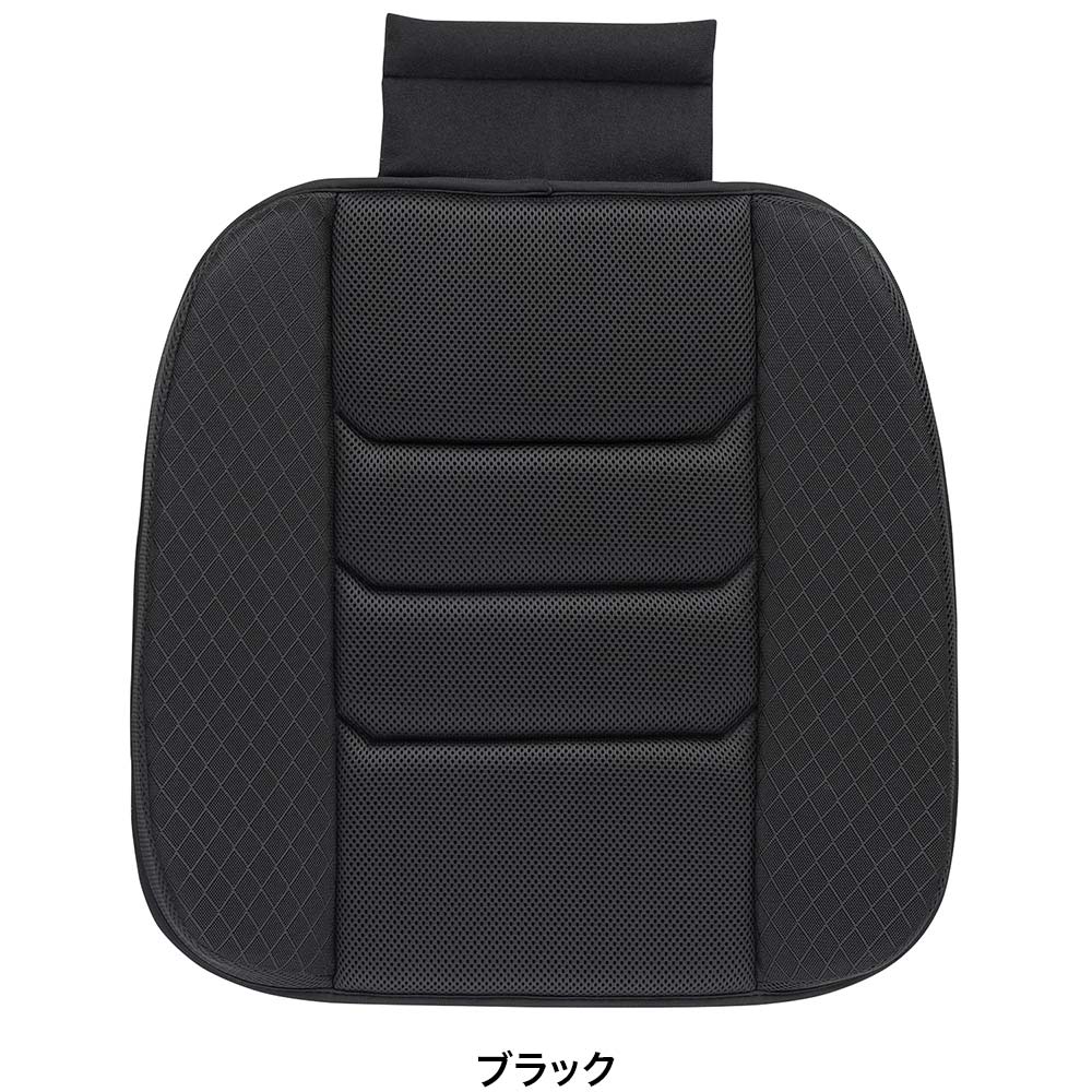約48×48cmの大判サイズ設計で幅広のシートにもしっかりフィット。両サイドに配した高さ約6cmのボリューム型サポートが身体を左右から保持し、安定した乗車姿勢をキープします。