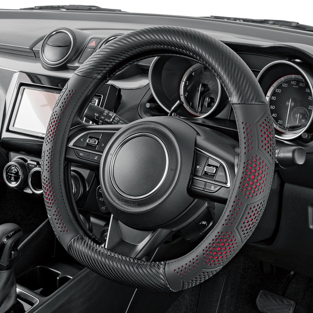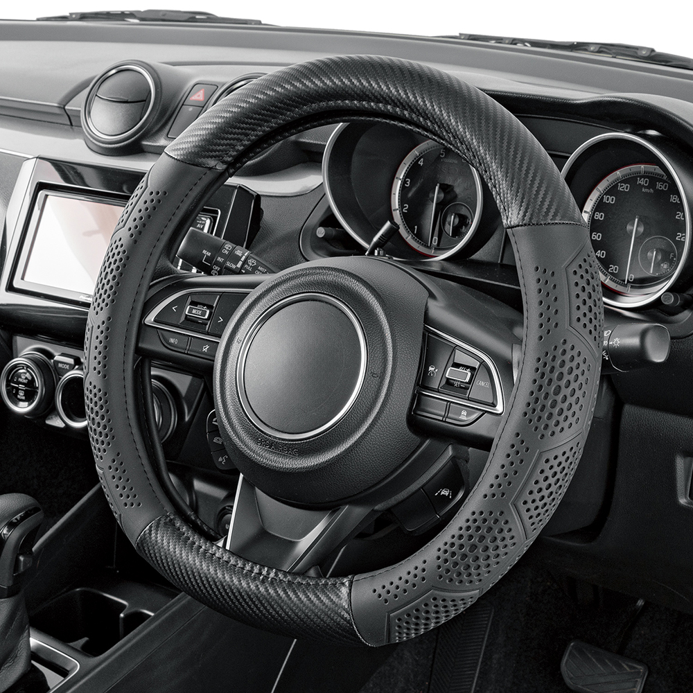 カーボン調のベースデザインにグリップ部分はパンチング加工のノンスリップ素材を採用。ハニカム模様のパンチングから覗くカラーリングがデザインのアクセント。カバーには、ハンドルが太くなりすぎない標準タイプのリングを採用しています。
